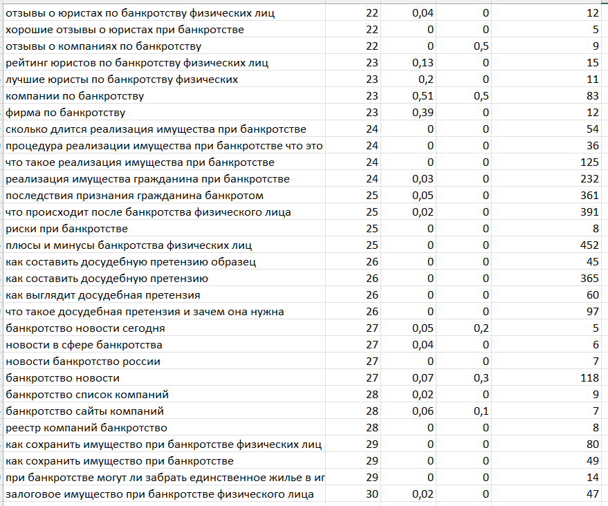 C использованием KeyCollector и Keys.so собраны ключевые слова. Произведено ранжирование высокочастотных, средне- и низкочастотных запросов. Ядро очищалось вручную, а затем проверялось на нецелевые запросы заказчиком.