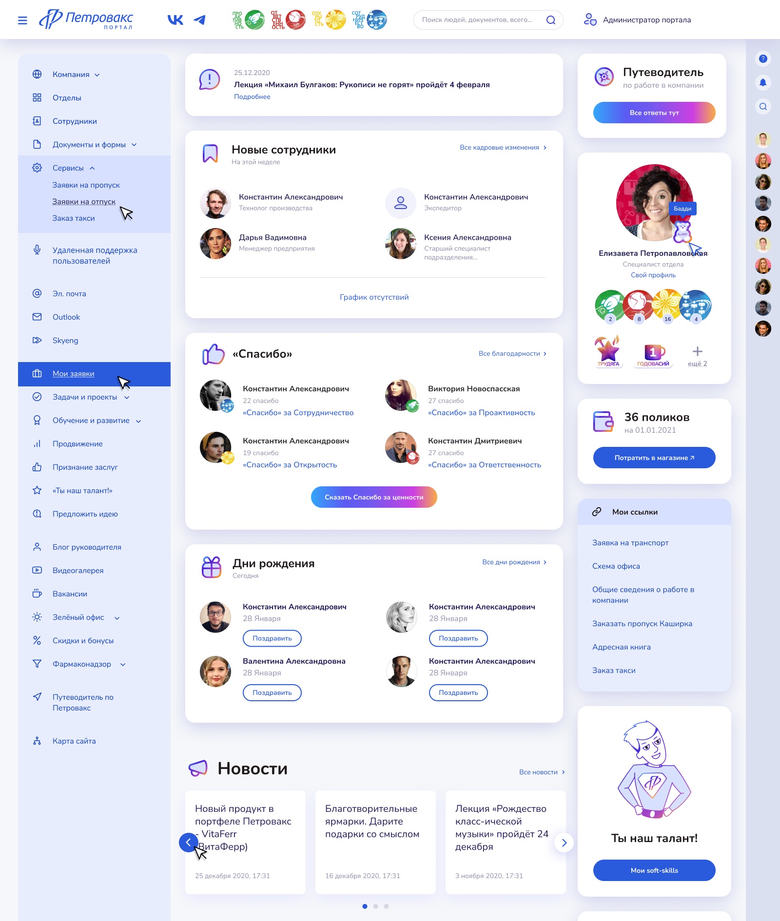 - На портале реализован функционал зарядки для сотрудников.